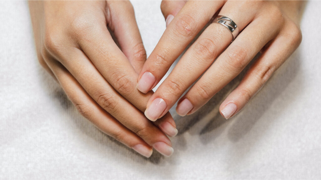 Ногти имеют естественный блеск, словно покрытые прозрачным лаком, но без искусственного покрытия.